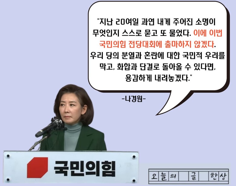 [세계타임즈 백진욱 기자] 오늘 25일 국민의 힘 나경원 전 의원이 국민의 힘 전당대회에 불출마를 선언한 것이 확인됐다.