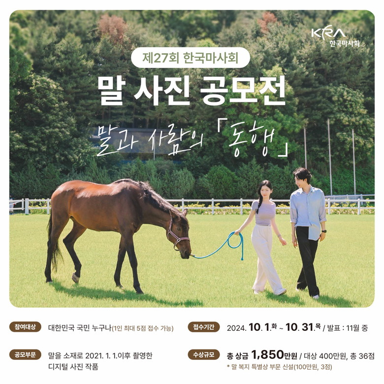 국내 유일의 ’말‘소재 사진 작품을 공모하는 말 사진 공모전은 1979년 시작돼 올해로 27회 차를 맞이했다. 올해 말 사진 공모전의 주제는 ‘동행’이다. 말 복지 증진과 동물복지 인식의 확산을 위해 기획된 이번 공모전 주제 ‘동행’을 통해 말과 사람의 파트너십과 행복한 동행이 담긴 작품들이 선보여질 것으로 기대된다. 특히 동물복지 요소가 가장 잘 표현된 작품 3점은 올해 신설된 ‘말복지 특별상’에 선정될 예정이다.