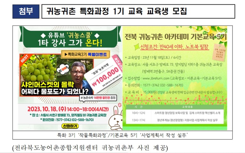 전라북도는 이번 작물특화 과정외에도 △도시민 상담홍보교육(김제시 10.19~20/ 순창군 10.30.~31/무주군 11.6~7/임실군 11.20~21/진안군 11.27~28) △ 전북 귀농귀촌 아카데미 기본교육 5기(11.18~21) 등 하반기 교육을 이어나갈 계획이다. 특히 아카데미 기본교육 5기는 귀농귀촌 창업자금, 스마트팜 청년창업 보육사업, 청년창업농 등 지원사업 관련하여 어려워하는 부분 중 하나인 사업계획서 작성 실무 과정으로 진행 할 예정이다.