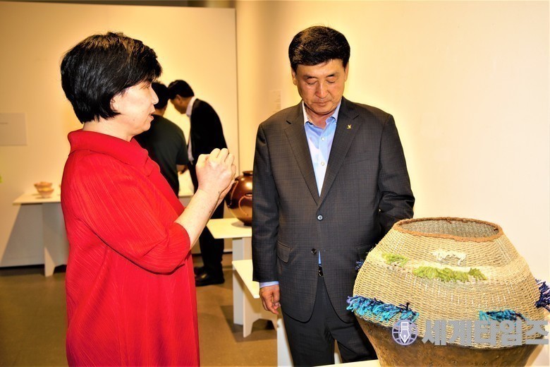 | ▲ 방세원 광주시장에게 작품을 설명해주고 있는 김지희 대표 |