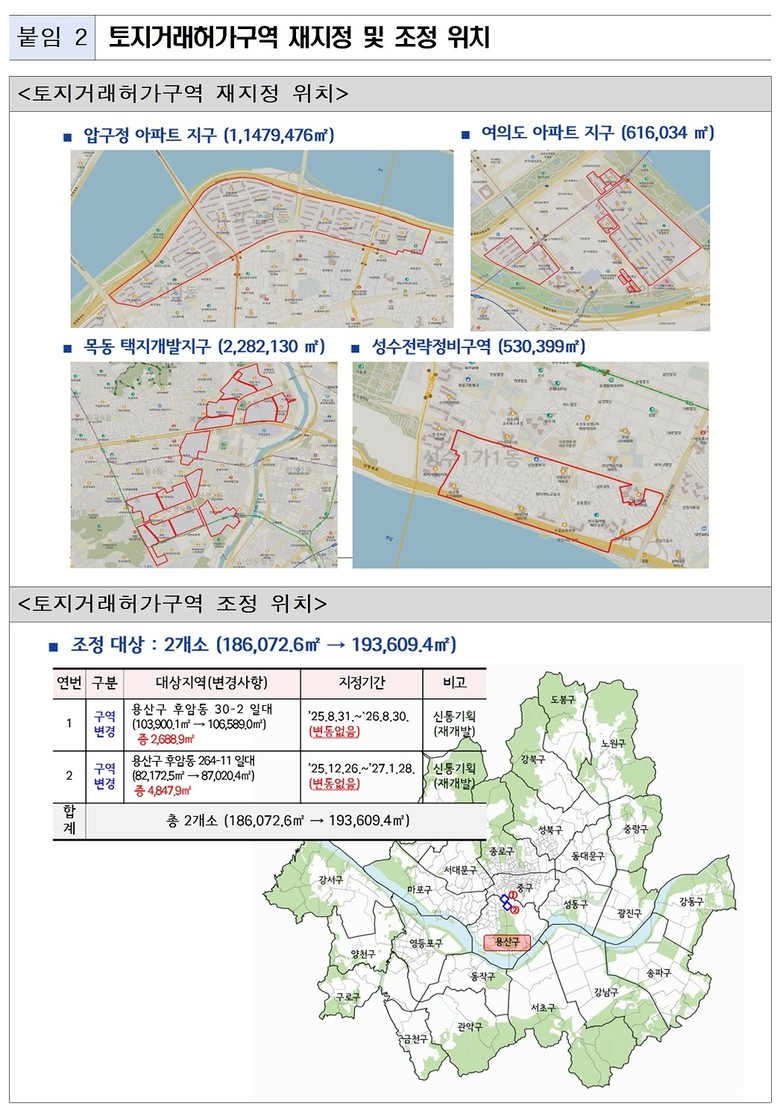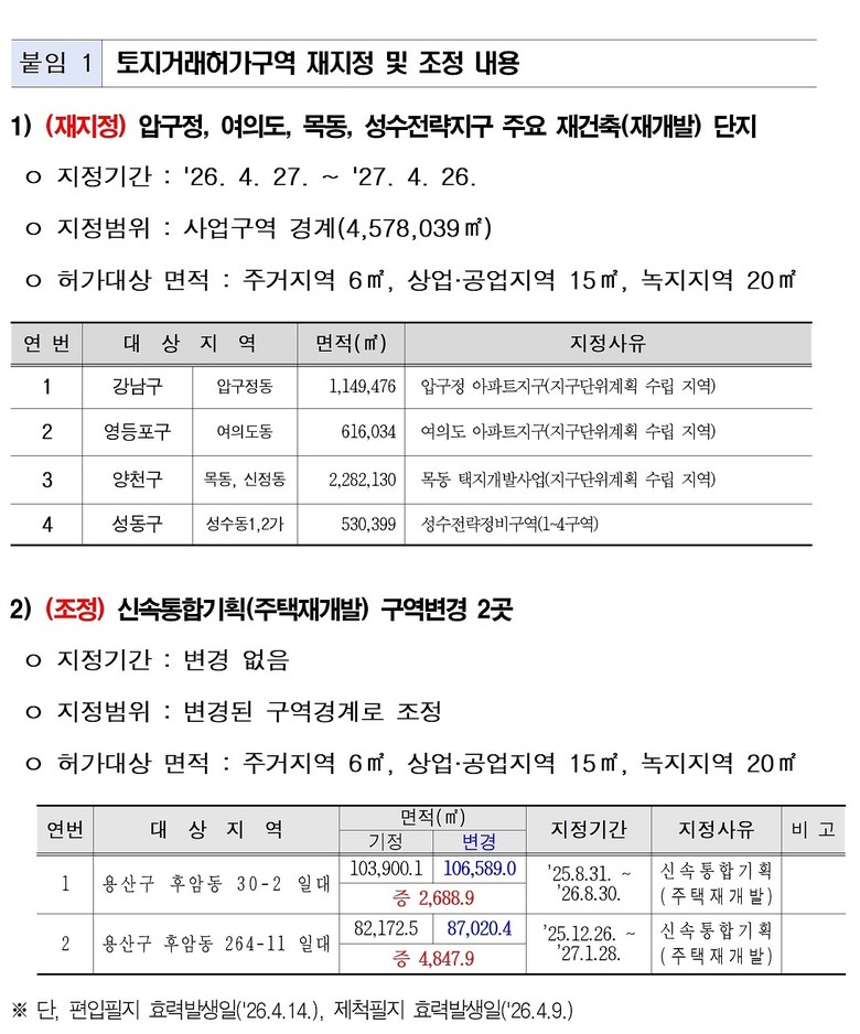 대상 지역은 강남구 압구정 아파트 지구, 영등포구 여의도 아파트지구, 양천구 목동 택지개발사업 아파트 단지, 성수동 성수전략정비구역으로 2027년 4월 26일까지 1년간 토지거래허가구역 지정이 연장된다.