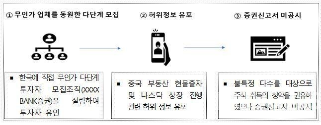부정거래 주요 특징은 무인가 투자 중개업체를 동원하여 다단계방식으로 투자자를 모집 하였고, 확인하기 어려운 중국정부의 부동산 현물출자에 대한 허위정보를 유포하였으며, 허위의 나스닥 상장을 미끼로 상장시 막대한 수익을 얻을 것이라고 투자자들을 유인한다는 것이다.