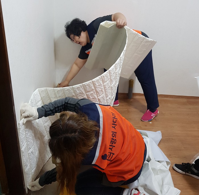 중국 다문화가정 왕규민 회원은 “오랫동안 곰팡이 냄새로 고생했는데, 오늘 사랑의 사다리 밴드에서 곰팡이가 심한 벽지를 교체해 주어서 진심으로 감사드린다.“고 말했다.