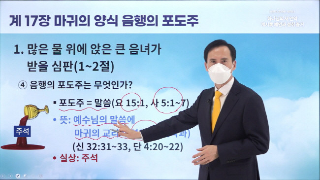 (6일 오전 신천지예수교회의 ‘하나님의 새 언약 계시록 예언과 성취 증거’ 세미나에서 이승주 시몬지파장의 요한계시록 17장 강의가 유튜브에서 실시간 스트리밍되고 있다)