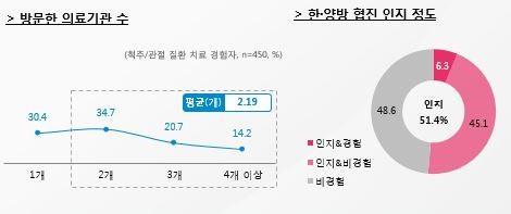 한·양방 협진에 대해서는 응답자의 51.4%가 알고 있었으며, 한·양방 협진을 경험한 응답자들은 치료효과에 대한 기대감(50.8%)과 비수술치료(30.2%) 등을 선택 이유로 밝혔다. ‘한·양방 한자리 진료’ 이용 의향을 밝힌 응답자는 전체의 70.4%로 연령과 성별, 지역 등에서 고른 분포를 나타냈다. 한자리 진료에 대해서 응답자의 약 72%(상호보완적인 치료가 가능하기 때문(41.6%), 진료의 편리함(30.4%))이상이 긍정적인 의사를 밝혔다.