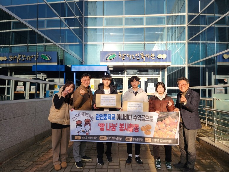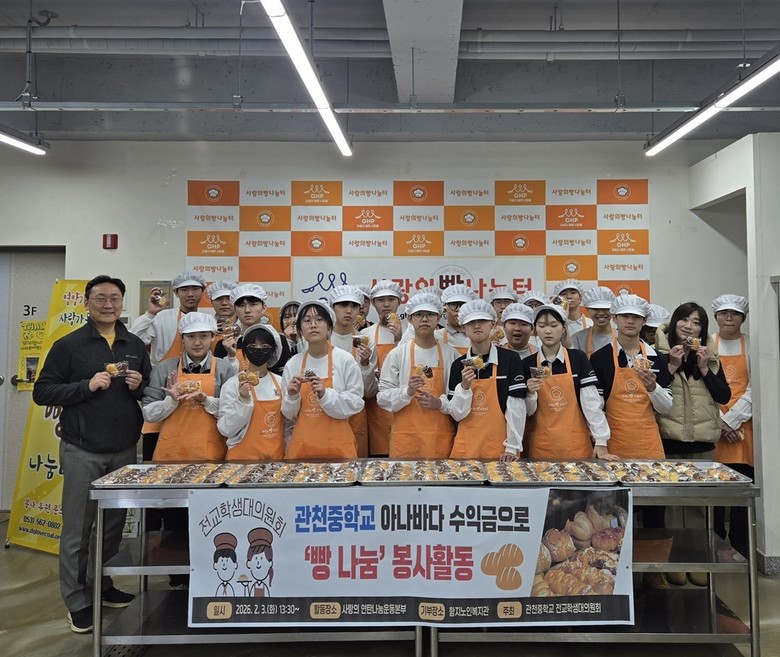 [대구 세계타임즈=한윤석 기자] 관천중학교(교장 김시동)는 전교학생대의원회 학생들이 주도적으로 운영한 아나바다 장터의 수익금을 바탕으로, 2026년 2월 3일(화) ‘사랑의 빵 나눔 봉사활동’을 실시하였다.