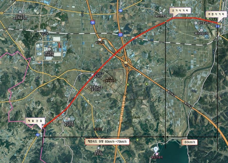 | ▲ 간양교차로-예산여중삼거리 50km→60km |