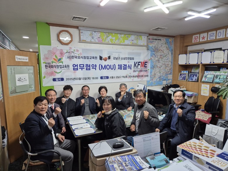 [세계타임즈]최성룡기자 =사단법인 한국외식창업교육원(이사장 안형상)과 강남구 소상공인연협회(회장 채송준)는 3월 13일 강남구 소상공인연합회 사무실에서 업무협약(MOU)식을 체결하고, 소상공인과 외식업계의 동반 성장을 위한 협력을 강화하기로 했다.