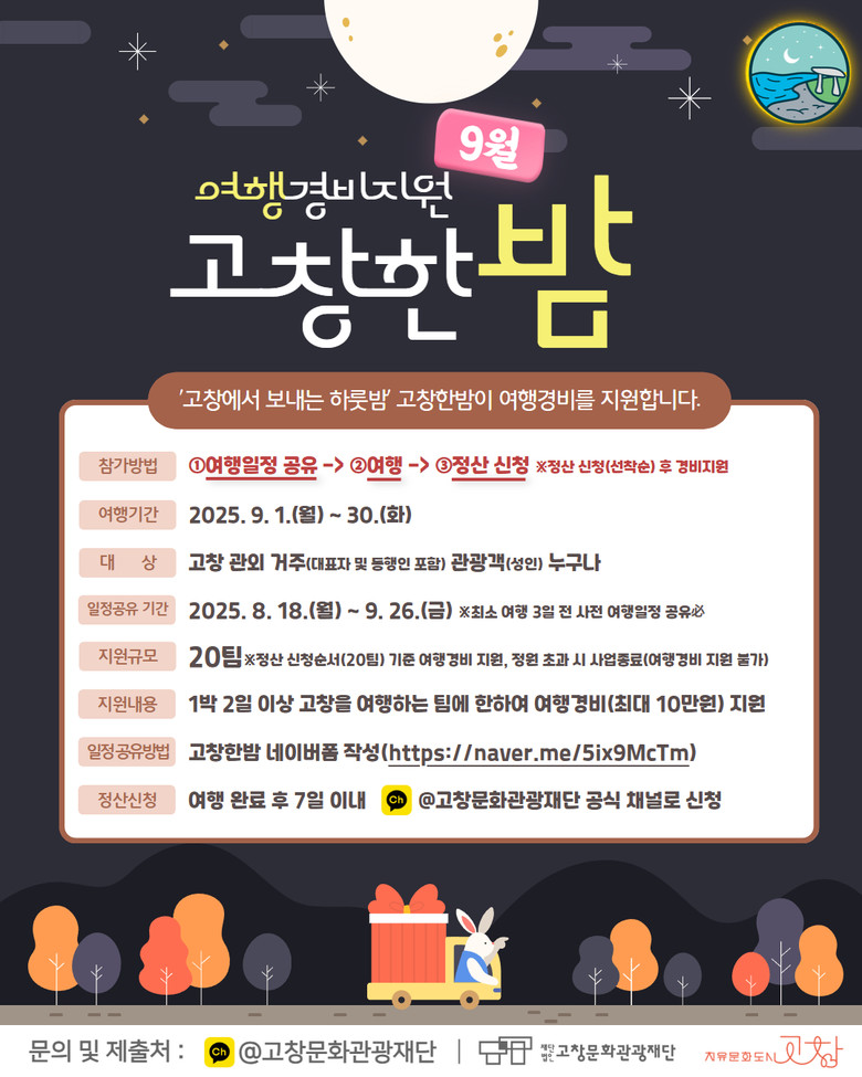 이번 9월 여행경비 지원은 9월 1일부터 30일까지 진행되며, 고창 외 지역 거주 성인 관광객이라면 누구나 신청 가능하다. 참여를 원한다면 사전 네이버폼을 통해 8월 18일부터 여행 일정을 공유하고, 숙박·관광지·식당 방문, SNS 인증 등의 조건을 충족하면 된다. 총 20팀을 대상으로 최대 10만원의 경비가 차등 지원되며, 정산 신청 순서에 따라 예산 소진 시 조기 마감될 수 있다.