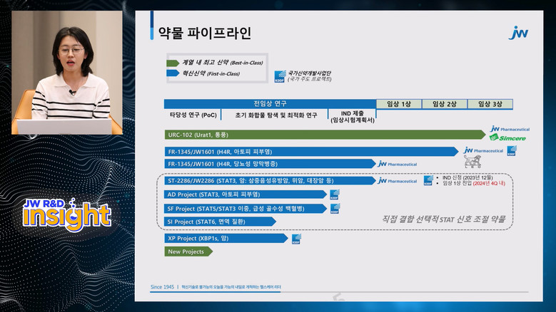 C&C신약연구소의 연구기획팀장이 출연해 AI 기반 자체 R&D 플랫폼, 국가신약개발사업 지원 과제, STAT3 표적항암제 JW2286의 전임상 결과 등을 설명했다.