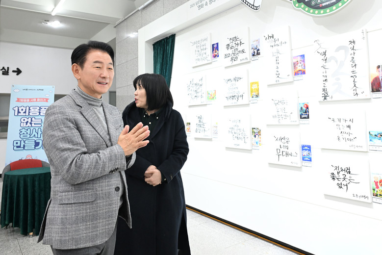 이날 김동근 시장은 본관 1층 로비에서 담은캘리그라피의 ‘영화 속 명대사(한글의 아름다움)’ 전시를 감상한 뒤, 연결통로로 이동해 ‘같이 걷는 발걸음’의 최소라 작가를 격려하고, 전시 공간 운영 방향에 대한 의견을 청취했다.