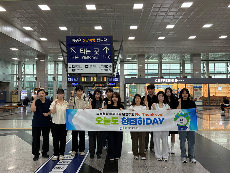 ▸ 청년 인턴 맞춤형 교육 이수로 사회 초년생 청렴 역량 강화 [세계타임즈=대구 한윤석 기자] 대구공공시설관리공단(이사장 문기봉)은 지난 9월 12일(금), 동대구역에서 청년 인턴들과 함께 시민들을 대상으로 청렴 캠페인을 펼쳤다.
