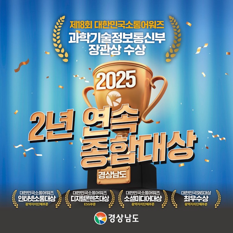 경남도는 지난해에 이어 올해도 ‘종합대상’을 차지하며 2년 연속 영예를 이어갔다. 13일 오후 서울 프레스센터에서 열린 시상식에서 도는 ‘종합대상’을 포함해 △인터넷소통대상(광역지자체 부문), △소셜미디어대상(광역지자체 부문), △디지털콘텐츠대상(ESG 부문) 등 총 4개 부문에서 대상을 수상했다.