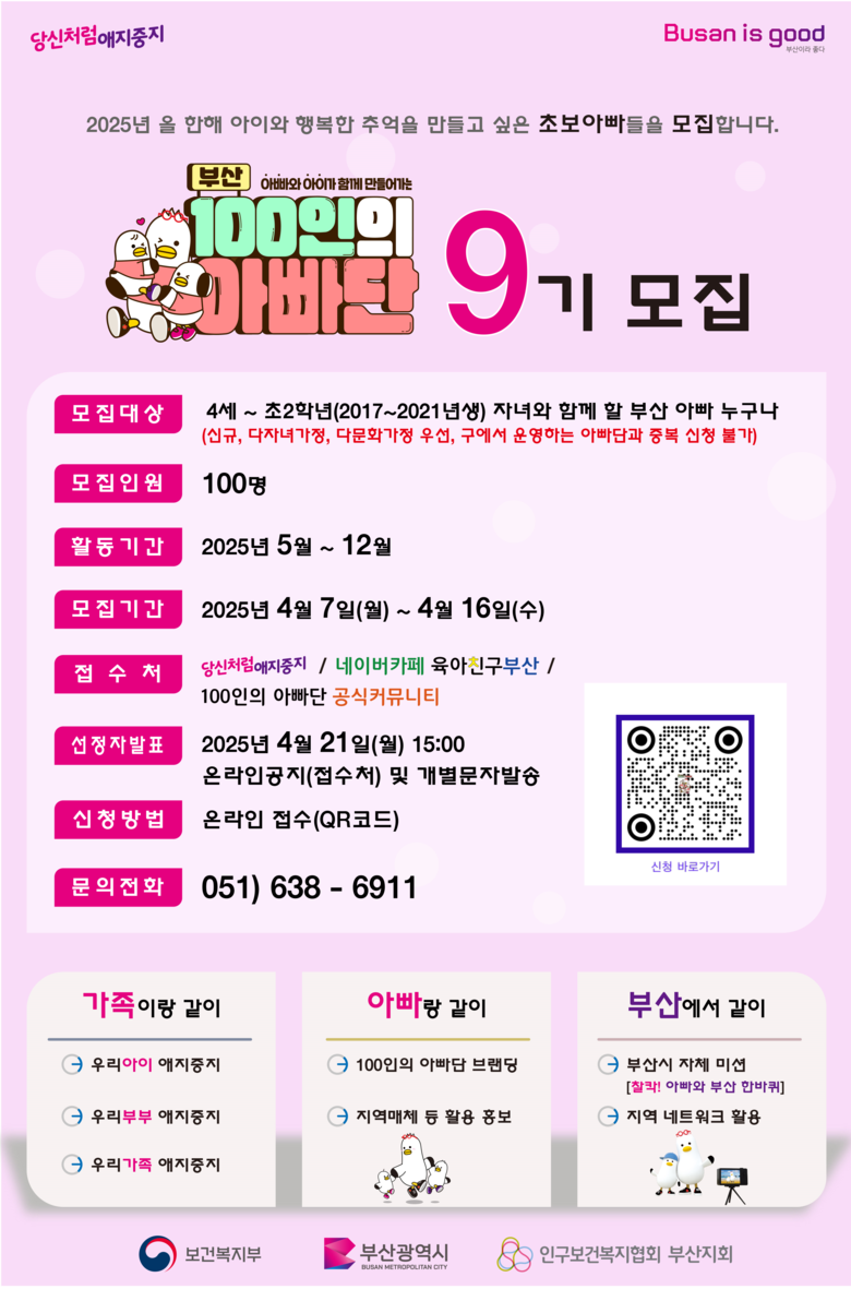 박설연 시 여성가족국장은 “집에서 어떤 놀이를 해야 할지, 아이와 어떤 체험 활동을 해야 할지 고민이 된다면 「부산 100인의 아빠단」을 통해 육아에 대해 긍정적인 경험을 하길 바란다”라며 “부산에서 함께 육아하고 모두가 행복하고 싶은 초보 아빠들의 적극적인 관심과 참여를 부탁드린다”라고 전했다.