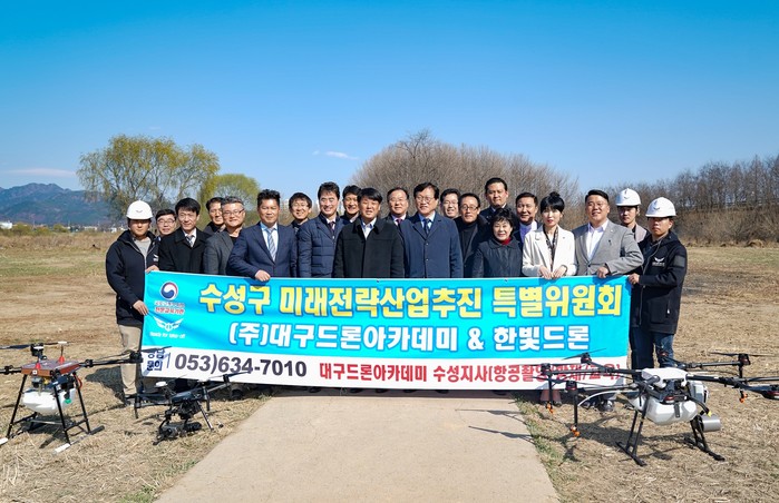 특위는 첫 번째 활동으로 지난 13일 14시 수성구 팔현마을 금호강 둔치에서 김대권 구청장, 수성구의회 의원, 드론아카데미 관계자 및 지역주민 등 50여명이 참석한 가운데 산업용 드론 시연행사를 개최하였다.