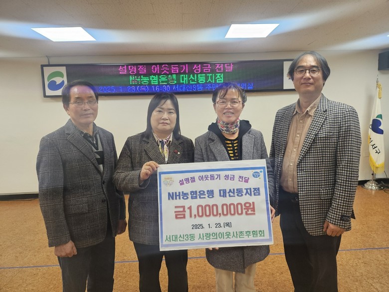 [서구 세계타임즈=이용우 기자] 부산 서구 NH농협은행 대신동지점(지점장 김선미 외 임직원)은 설 명절을 맞아 서대신3동 주민센터(동장 사공순옥)에 성금 100만 원을 기탁했다. 전달받은 성금은 서대신3동 이웃사촌후원회(회장 박쌍남)를 통해 어려움을 겪고 있는 주민들을 위해 사용될 예정이다.