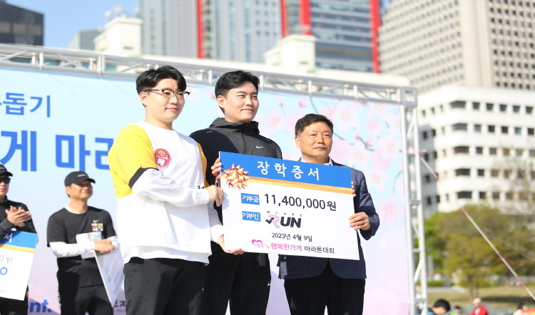 9일 서울 여의도 한강공원 일대에서 열린 ‘행복한 가게 마라톤 대회’는 기부 문화 확산을 위한 캠페인으로, 참가자 30명 이상의 단체와 소외 계층 1명을 매칭해 참가비 100% 전액을 장학금으로 전달하는 행사이다.
