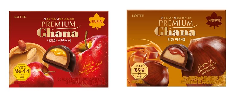 이번 신제품은 가을 제철 과일인 사과와 밤을 활용한 쉘 형태의 초콜릿 ▲'프리미엄 가나 사과와 피넛버터' ▲'프리미엄 가나 밤과 카라멜' 2종이다.