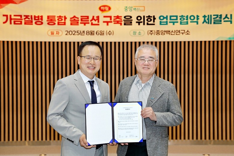 ㈜하림은 지난 8월 6일 중앙백신연구소 본사에서 정호석 대표이사와 중앙백신연구소 윤인중 대표이사 등 양사 주요 관계자들이 참석한 가운데 '가금질병 통합 솔루션 구축을 위한 업무협약(MOU)'을 체결했다고 7일 밝혔다.