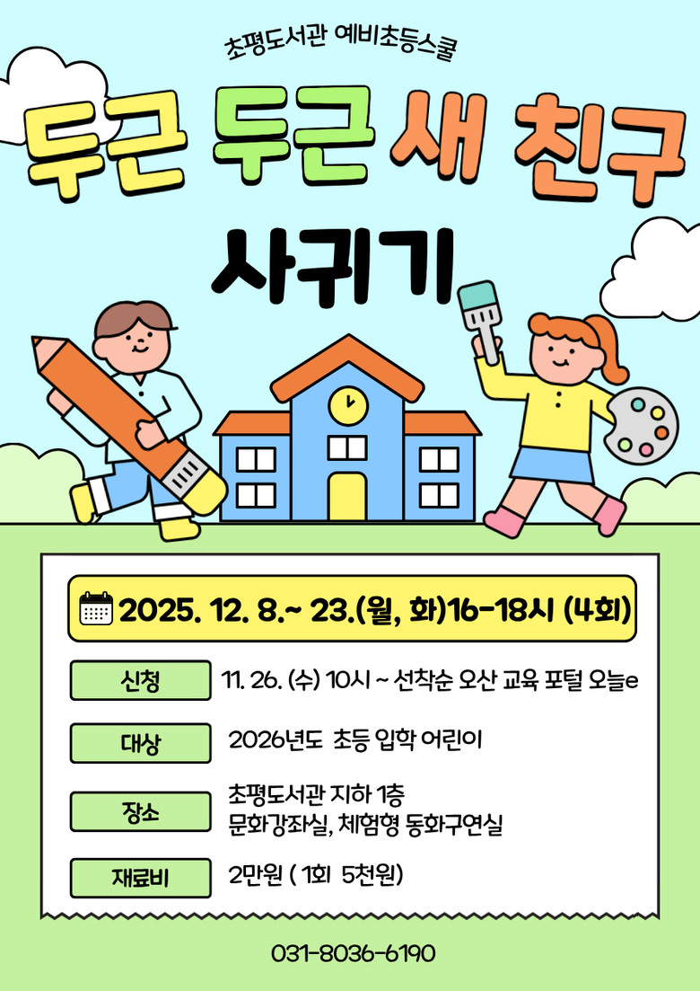 ‘예비초등스쿨’은 2026년도 초등학교 입학 예정인 미취학 어린이 10명을 대상으로 하며, 교과 연계 도서를 활용한 창의적 독후 활동과 체험형 동화구연을 제공한다. 체험형 동화구연은 어린이가 텔레비전 화면 속 주인공으로 등장해 이야기를 이끌어가는 참여형 방식으로 구성되어 몰입감을 높인 것이 특징이다.