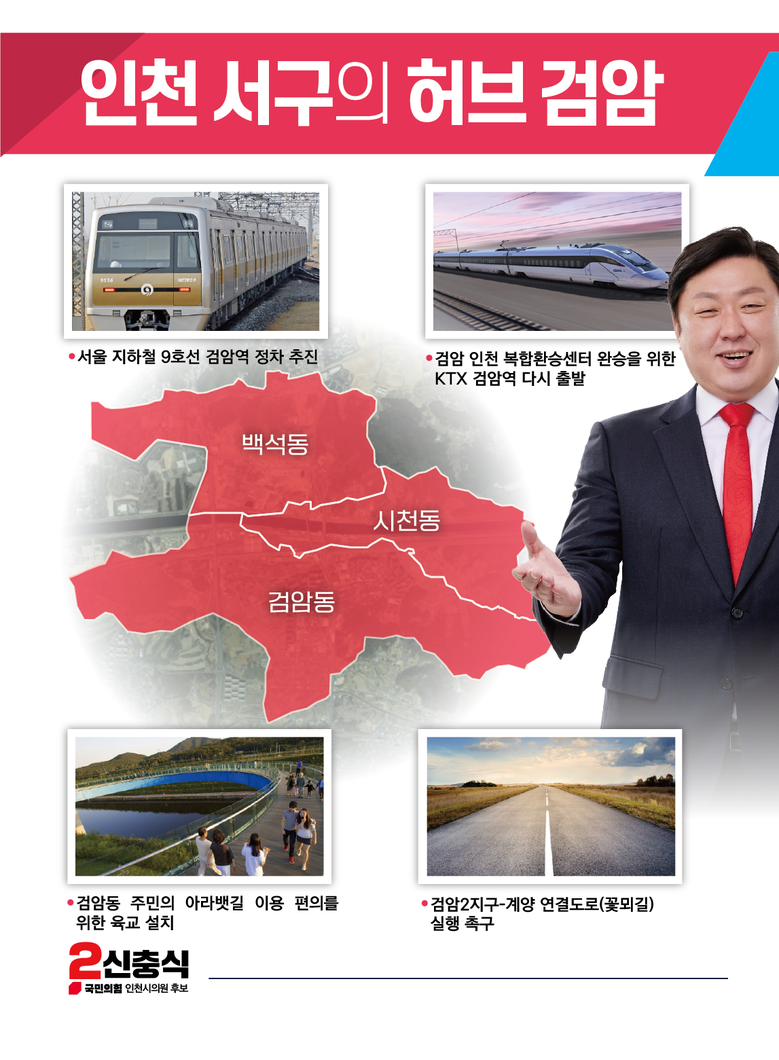 신 후보의 검암 지역 맞춤형 공약은 ▲서울 지하철 9호선 검암역 정차 추진 ▲검암 인천 복합환승센터 환승을 위한 KTX 검암역 재 출발 ▲육교 설치를 통한 검암 주민들의 아라뱃길 이용 편의 확충 ▲검암 2지구~계양 연결도로, 꽃뫼길 실행 촉구 등이다.