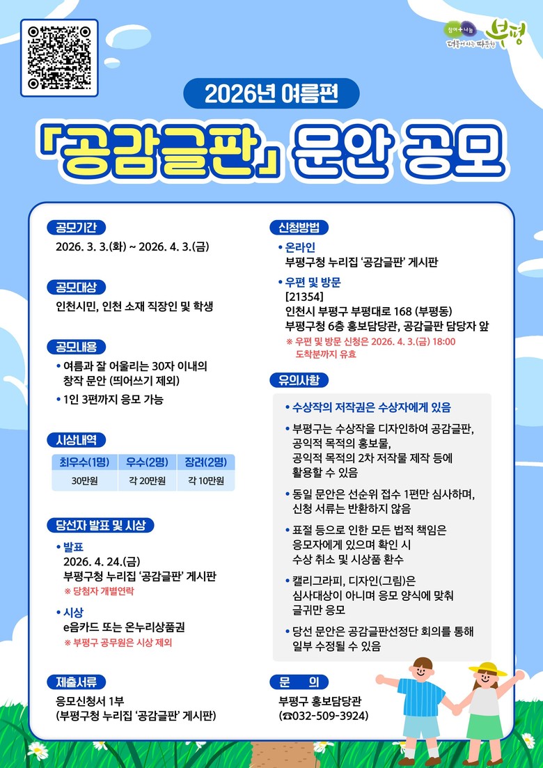 한편, 기타 자세한 내용은 부평구 누리집(www.icbp.go.kr)을 참고하거나 구청 홍보담당관(☎509-3924)으로 문의하면 된다.