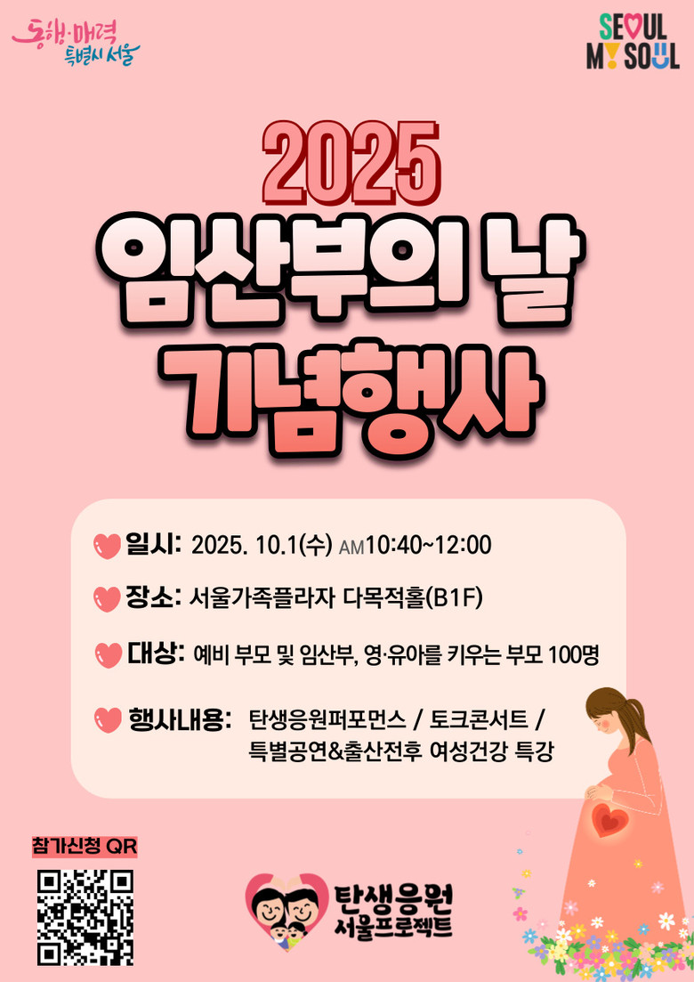 이와 관련해 서울시는 10월1일(수) 오전 10시 40분 서울가족플라자 다목적홀에서 ‘2025 임산부의 날 기념행사’를 개최한다고 밝혔다. 이번 행사는 저출생 시대에 더욱 중요해진 생명의 소중함과 출산의 가치를 함께 나누고, 임산부를 배려하는 문화를 우리 사회 전반으로 확산하기 위해 마련됐다.