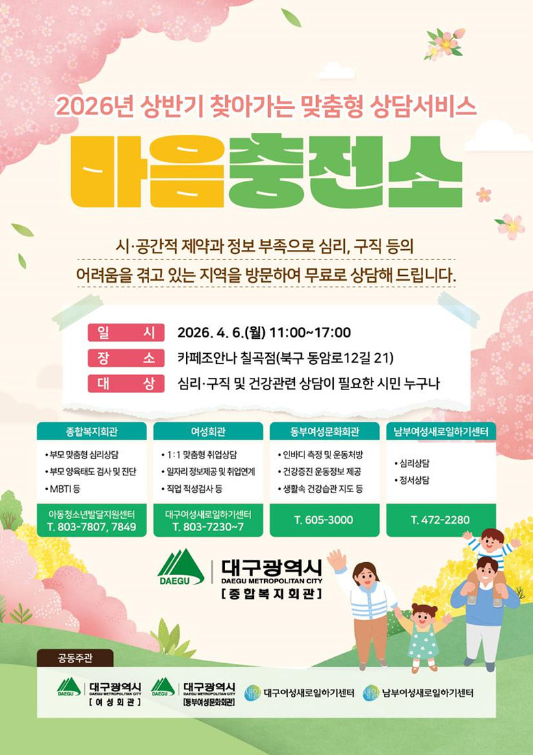 ▸ 심리·구직·건강 등 분야별 전문상담사와 1:1 맞춤형 서비스 제공 [세계타임즈=대구 한윤석 기자] 대구광역시 종합복지회관은 4월 3일(금) 북구 동천동 소재 카페조안나 칠곡점에서 2026년 상반기 찾아가는 현장상담 프로그램 ‘마음충전소’를 운영한다.