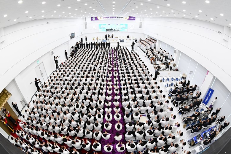 신천지 정읍교회가 설립 17년 만에 전북 정읍시 시기동에 새 교회를 봉헌해 13일 5000여 명의 성도가 교회 밖까지 자리를 메웠다.