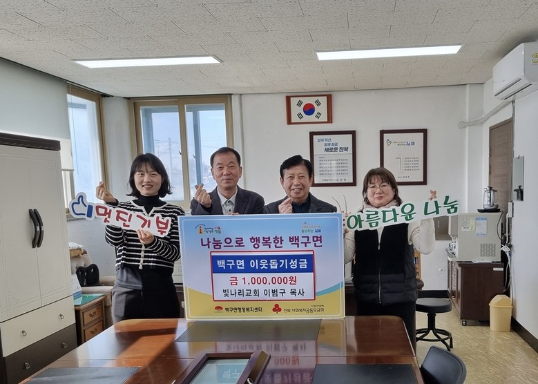 [김제 = 세계타임즈 김서주 기자] 김제시 백구면 행정복지센터는 빛 나리교회(목사 이범구)가 지난 14일 1백만 원의 이웃돕기 성금을 전달했다고 밝혔다.