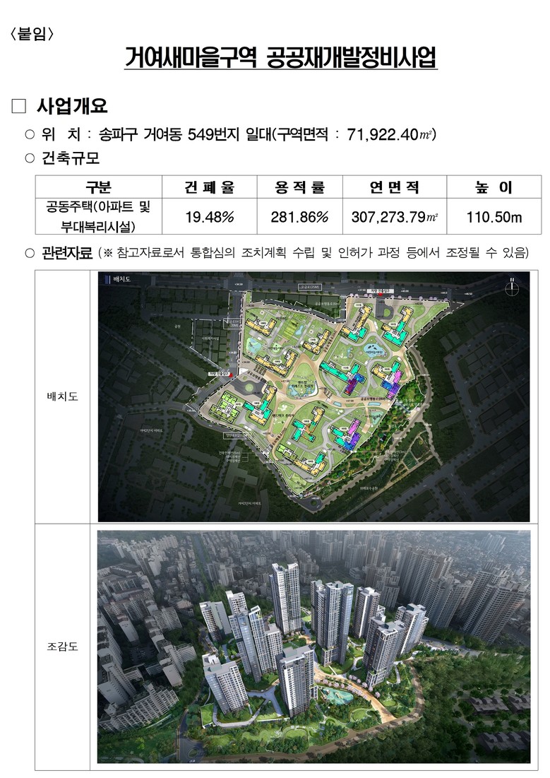 단지는 2040 서울도시기본계획을 반영해 주변 거여·마천재정비촉진지구, 위례택지지구와 조화로운 스카이라인을 형성하고, 기존 주거지역과 인접한 남·서측 구간은 층수를 낮춰 지역과 상생하는 개발을 추진한다. 어린이집, 다함께 돌봄센터 등 생활밀착형 공공시설도 단지 내 설치해 주민의 편의성을 높일 계획이다.