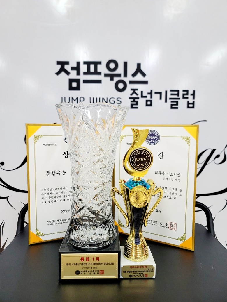 김지영 대표가 운영하는 점프윙스 줄넘기 전문 학원은 2025년 1월에 세계줄넘기총연맹에서 주최 및 주관하는 전국클럽대항전 줄넘기 대회에 50여명의 선수가 출전하여 전국 종합 1위라는 쾌거와 4년 연속 최우수 학원 선정 및 지도자상을 받았다.