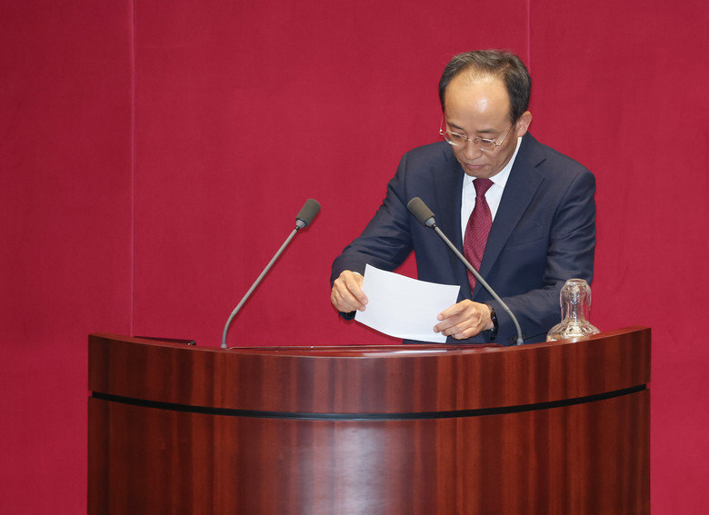 계엄 해제 의결을 방해한 혐의(내란 중요임무 종사)로 구속영장이 청구된 국민의힘 추경호 의원이 27일 국회 본회의장에서 자신의 체포동의안 표결을 앞두고 신상발언을 준비하고 있다. 2025.11.27