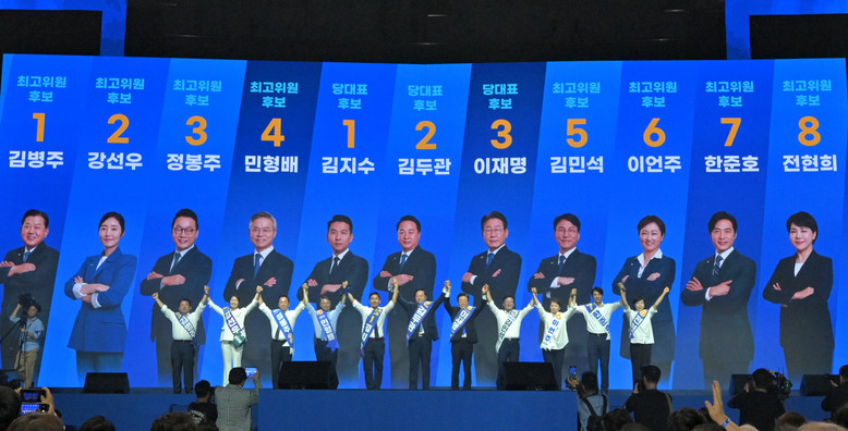 [세계타임즈 = 심귀영 기자] 18일 오후 서울 송파구 올림픽공원 KSPO돔에서 열린 더불어민주당 전국당원대회에서 이재명 대표 후보를 비롯한 최고위원 후보들이 당원을 향해 인사하고 있다. 2024.8.18