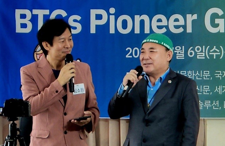 사진=좌측)심소원 아나운서가 김재덕 BTCS 장학재단 이사장에게 "비트코인 사토시" 핵심 블룩체인 기술에 대해서 질문을 하고 있는 장면
