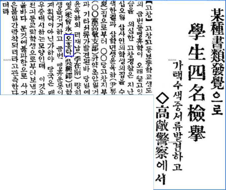 | ▲ ‘동아일보’ 1929년 6월 27일자 중 오흥탁 선생이 고창고등보통학교 동맹휴학 사건으로 학우들과 함께 체포된 내용이 기술되어 있다. |