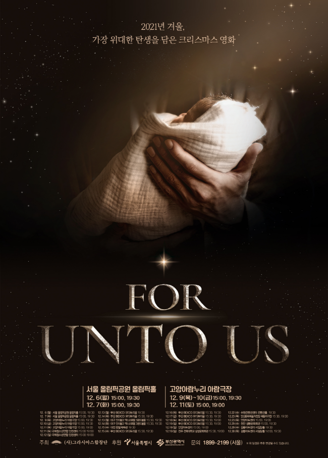 'For Unto Us'는 매년 많은 사랑을 받아온 그라시아스합창단의 공연, '크리스마스 칸타타'를 각색해 제작된 영화로 우리에게 친숙한 We Wish You a Merry Christmas, O Tannenbaum, Handel’s Oratorio “Messiah” 등 캐롤과 클래식 명곡도 그라시아스합창단만의 맑은 음색으로 만날 수 있다.