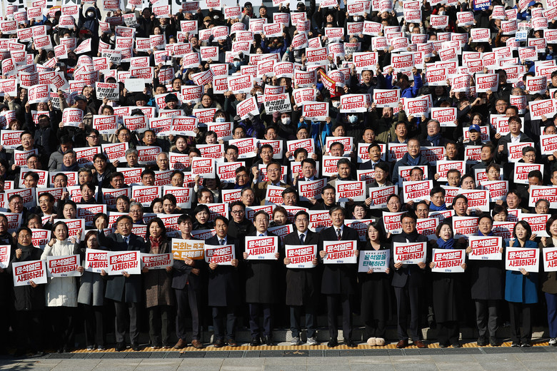 4일 서울 여의도 국회 본청 앞 계단에서 열린 '윤석열 대통령 사퇴촉구 탄핵추진 비상시국대회'에서 더불어민주당 이재명 대표, 조국혁신당 조국 대표를 비롯한 야당 의원들이 구호를 외치고 있다. 2024.12.4