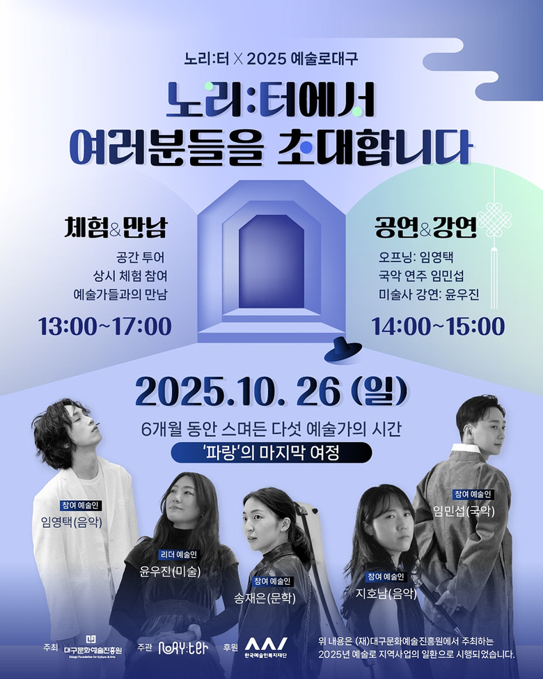 ‘노리:터’는 예술과 놀이, 휴식이 공존하는 도심형 복합문화공간으로, 진흥원과 협력해 지역 예술인과 시민을 잇는 ‘생활 속 예술 실험공간’으로 기능하고 있다. 올해 상반기부터 ‘2025 예술로 대구’ 사업의 협업 기업으로 참여하며, 지역 예술인들이 이곳에서 장르 경계를 넘어 예술 활동을 이어오고 있다.