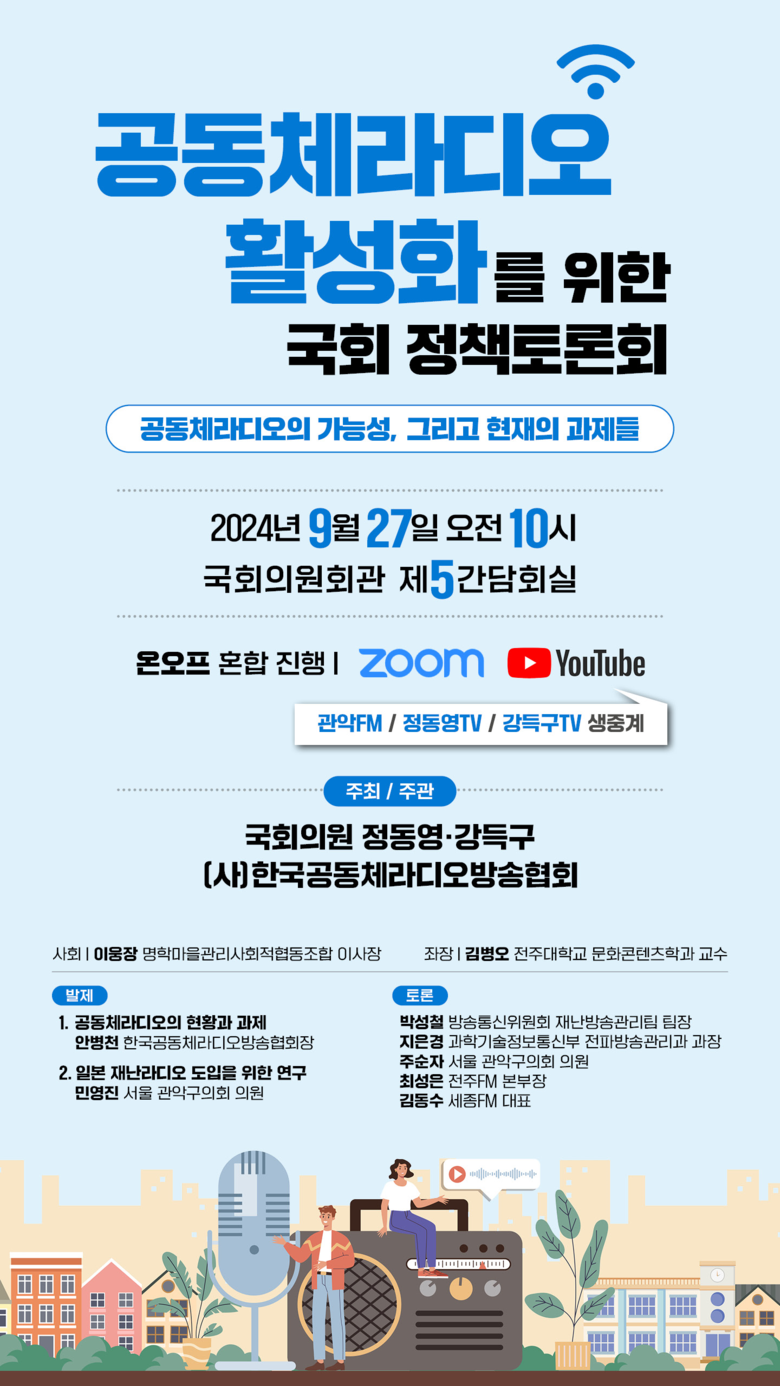 더불어민주당 정동영 국회의원 (국회 과학기술정보방송통신위원회)과 강득구 국회의원 (국회 환경노동위원회)은 27일(금) 국회의원회관 제5간담회실에서 ‘공동체라디오 활성화를 위한 정책토론회 - 공동체라디오의 가능성, 그리고 현재의 과제들’을 열고 전문가들과 실천가능한 대안을 모색했다.