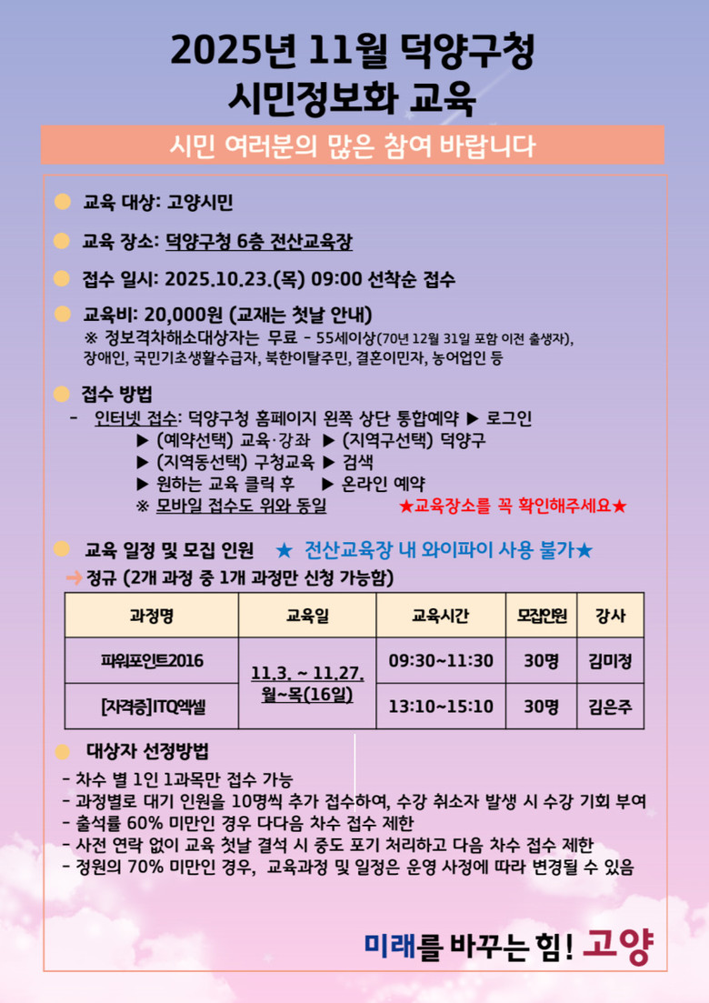 이번 교육은 11월 3일부터 27일까지 주 4일(월~목) 덕양구청 6층 전산교육장에서 진행되며 ▲파워포인트 2016 ▲ITQ 엑셀 과정으로 구성돼 있다.
