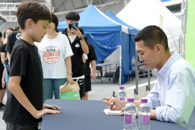 | ▲ 지난해 용인미르스타디움에서 열린 _2024 용인시민 페스타_에서 팬사인회를 진행한 남자 높이뛰기 우상혁 선수 |