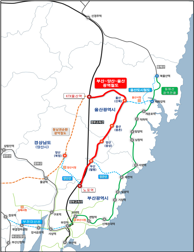'부산~양산~울산 광역철도'는 총연장 47.6킬로미터(㎞)(부산 8.9㎞) 규모로, 노포역에서 케이티엑스(KTX)울산역까지 약 45분(35회/일)만에 이동 가능하며, 경전철(AGT-철제차륜) 차량으로 운영될 계획이다.