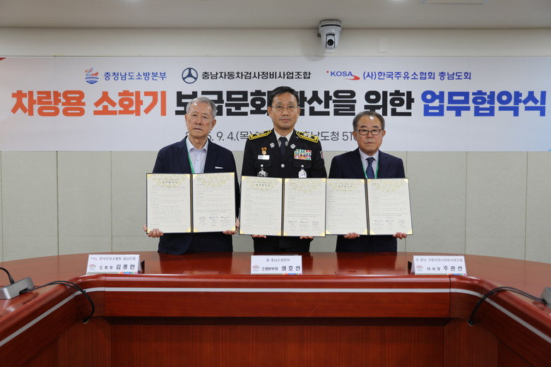 차량 화재 시 신속한 초기 대응으로 인명·재산 피해를 최소화하고자 마련한 이번 협약식에는 성호선 충남소방본부장과 주관선 충남자동차검사정비사업조합 이사장, 김종만 한국주유소협회 충남도회장 등이 참석했다.