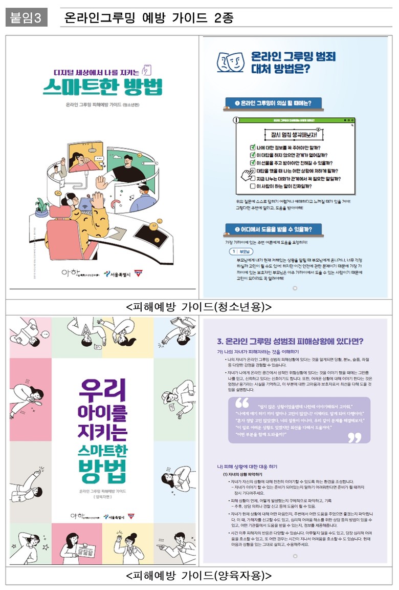 서울시는 이날 토론회에서 ‘온라인 그루밍 예방 가이드’를 배포하고 아동·청소년 성착취를 효과적으로 예방하는 정책을 소개한다.
