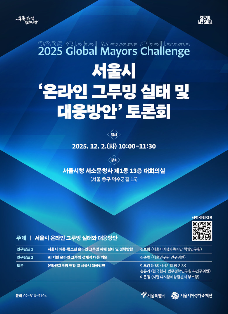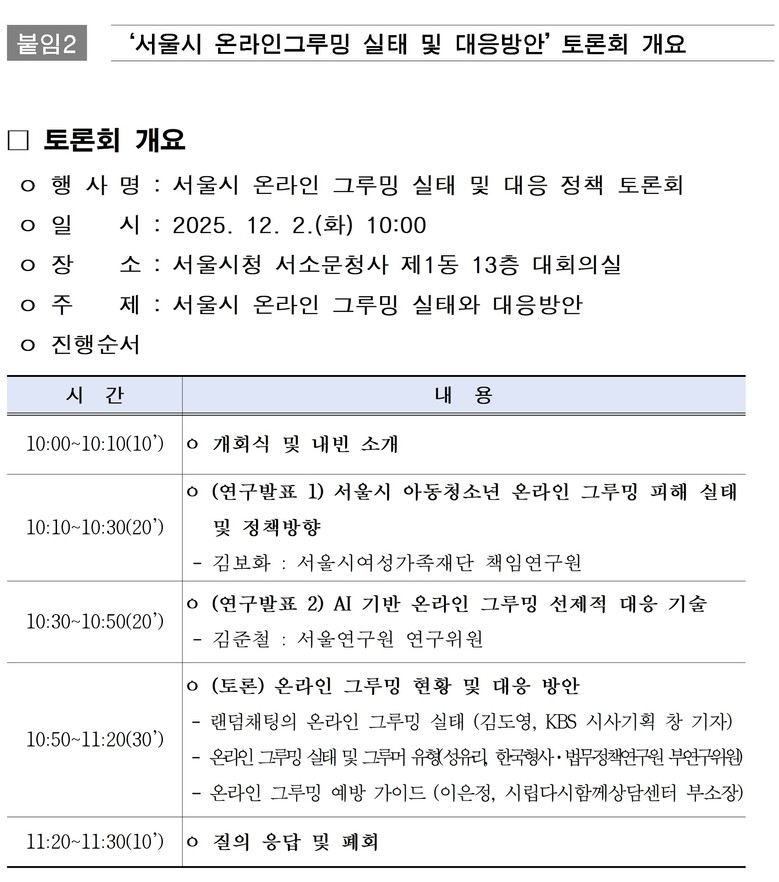 - 12.2.(화) ‘서울시 온라인 그루밍 실태 및 대응방안 토론회’ 개최…예방 가이드 배포
