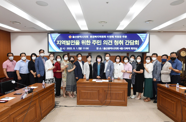 [울산 세계타임즈=이호근 기자] 울산시의회 이영해 환경복지위원장은 8월 1일 오전 11시, 시의회 4층 다목적회의실에서 대현동, 선암동 주민들과 ‘지역발전을 위한 주민 의견 청취 간담회’를 가졌다.