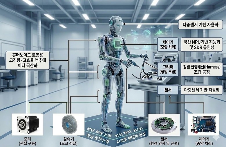 경남은 조선·방산·항공·기계 등 전국 최고 수준의 제조 실증 현장을 갖춘 지역으로, 이번 전략을 통해 2030년까지 휴머노이드로봇 SI기업 등 선도·전문 로봇기업 40개 육성, 핵심부품(감속기, 모터, 그리퍼, 센스, 제어기 등) 국산화율 70% 달성, AI로봇 관련 인력 12,800명 양성을 목표로 제시했다.
