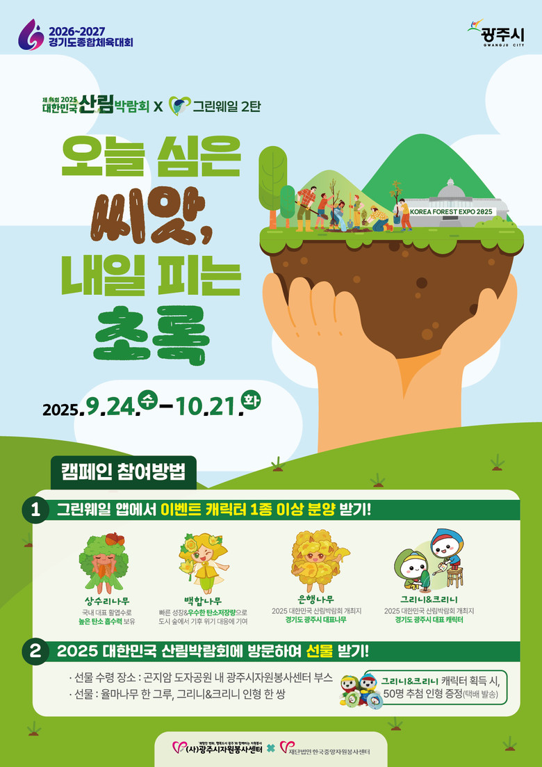 [세계타임즈=광주시 송민수 기자] (사)광주시자원봉사센터(이사장 방세환)는 9월 24일(수)부터 10월 21일(화)까지 「오늘 심은 씨앗, 내일 피는 초록」 캠페인을 운영하고 있다.