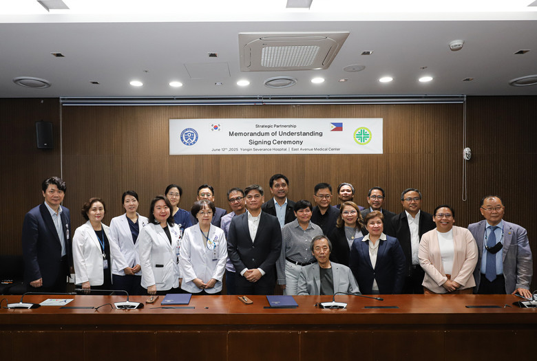 | ▲지난 12일 용인세브란스병원 5층 대회의실에서 진행된 용인세브란스병원과 필리핀 이스트 애비뉴 메디컬 센터(East Avenue Medical Center)의 MOU 체결식에서 참석자들이 기념사진 촬영을 진행하고 있다.(사진=용인세브란스병원) |